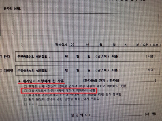 ƯÈ÷ º¸È£ÀÚ¿¡°Ô ¼ö¼úµ¿ÀǼ¸¦ ¹Þ´Â °úÁ¤¿¡¼ "ÀÇÇÐÀû ÀÌÇØ°¡ ¾î·Á¿î ¹Ì¼º³âÀÚ´Â ¼ö¼ú³»¿ëÀ» ÀÌÇØÇϱ⠾î·Á¿ö ´ë¸®ÀÎ ¼¸íÀ» ¹Þ´Â´Ù"´Â ³»¿ëÀÌ ¸í½ÃµÇ´Âµ¥, º´¿ø Ãø¿¡ ¼ÕÇØ¹è»ó Ã¥ÀÓÀ» ¹¯´Â °ÍÀº ÀǾÆÇÏ´Ù´Â ¹ÝÀÀÀÌ Áö¹èÀûÀÌ´Ù.