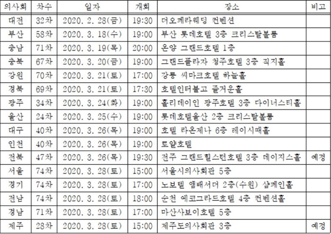 ½ÃµµÀÇ»çȸ Á¤±âÃÑȸ´Â ÀÌ´Þ 28ÀÏ ´ëÀüÀ» ½ÃÀÛÀ¸·Î, 3¿ù 18ÀÏ ºÎ»ê, 24ÀÏ ±¤ÁÖ, 26ÀÏ ÀÎõ, 28ÀÏ ¼¿ï, 28ÀÏ °æ±â, 28ÀÏ Á¦ÁÖ µî¿¡¼ ¼øÂ÷ÀûÀ¸·Î ¿¸°´Ù.