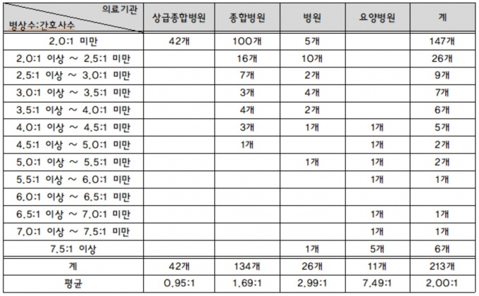¼³¹®¿¡ ÀÀ´äÇÑ 213°³ º´¿ø °£È£ºÎ ¼Ò¼Ó °£È£»ç 1ÀÎ´ç º´»ó¼ö´Â 2°³¿´À¸³ª, »ó±ÞÁ¾ÇÕº´¿øÀº 0.95°³, Á¾ÇÕº´¿øÀº 1.69°³, º´¿øÀº 2.99°³, ¿ä¾çº´¿øÀº 7.49°³·Î ÀÇ·á±â°ü ±Ô¸ðº° Å« Â÷À̸¦ º¸¿´´Ù.