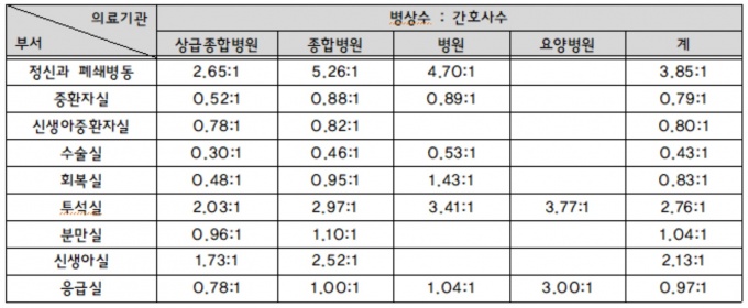 º´¿ø°£È£»çȸ °ü°èÀÚ´Â "ÀÀ±Þ½Ç¿¡¼ÀÇ °£È£»ç 1ÀÎÀÌ ´ã´çÇÏ´Â º´»ó¼ö´Â 0.97°³, ȸº¹½ÇÀº 0.83°³, ½Å»ý¾ÆÁßȯÀÚ½ÇÀº 0.80°³, ÁßȯÀÚ½ÇÀº 0.79°³, ¼ö¼ú½ÇÀº 0.43°³ÀÎ °ÍÀ¸·Î Á¶»çµÆ´Ù"°í ¹àÇû´Ù. |