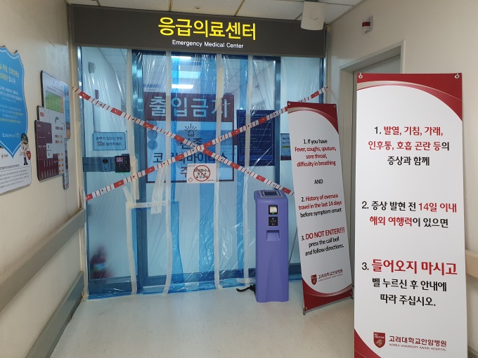 ÇöÀç °í´ë¾È¾Ïº´¿ø ÀÀ±ÞÀÇ·á¼¾ÅÍ ÀÔ±¸¿¡´Â ÃâÀÔÀ» ±ÝÁöÇÏ´Â ºÓÀº ÁÙÀÌ ÃÄÁ³°í ‘°ú»êȼö¼Ò ¸ê±Õ Áß ÃâÀÔ±ÝÁö’¶ó´Â ¾È³»¹®°ú ÃâÀÔÀ» ±ÝÁöÇÏ´Â Å×ÀÌÇÁ°¡ XÀÚ ¸ð¾çÀ¸·Î ºÎÂøµÆ´Ù.[»çÁø]
