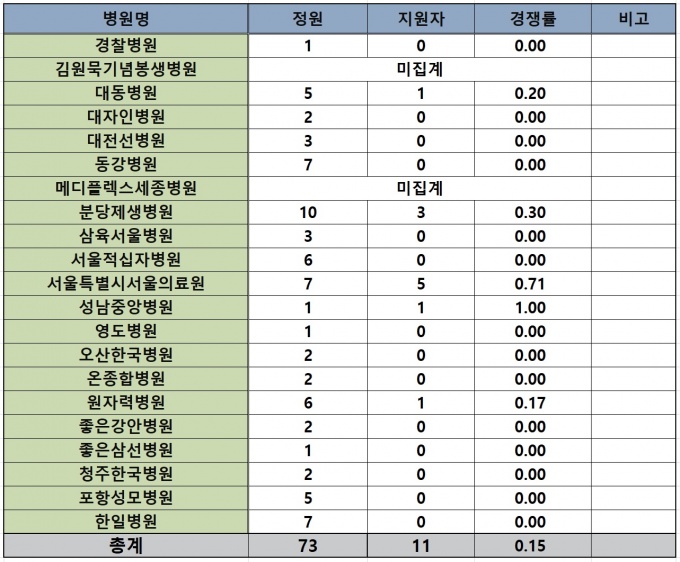 À̹ø¿¡ ÀÎÅÏ Ãß°¡¸ðÁýÀ» ÁøÇàÇÑ 21°³ º´¿ø Áß °á°ú°¡ Áý°èµÇÁö ¸øÇÑ 2°³ º´¿ø(±è¿ø¹¬±â³äºÀ»ýº´¿ø, ¸ÞµðÇ÷º½º¼¼Á¾º´¿ø)À» Á¦¿ÜÇÏ¸é ¸ðÁýÁ¤¿øÀ» ¸ðµÎ ä¿î º´¿øÀº 1°÷¿¡ ºÒ°úÇß´Ù.