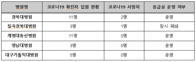 Áö³ 25ÀÏ ±âÁØÀ¸·Î ´ë±¸½Ã ¼ÒÀç ´ëÇüÀÇ·á±â°üÀÎ °æºÏ´ëº´¿ø, Ä¥°î°æºÏ´ëº´¿ø, °è¸í´ëµ¿»êº´¿ø, ¿µ³²´ëº´¿ø, ´ë±¸°¡Å縯º´¿ø¿¡´Â ÃÑ 33¸íÀÇ Äڷγª19 È®ÁøÀÚ°¡ ÀÔ¿øÇØÀÖ´Â ½ÇÁ¤ÀÌ´Ù. ÀÌ °¡¿îµ¥ ÀÀ±Þ½ÇÀ» Æó¼âÇÑ °÷Àº Ä¥°î°æºÏ´ëº´¿øÀÌ À¯ÀÏÇÏ´Ù.