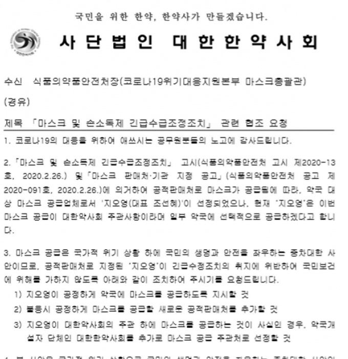 27ÀÏ ´ëÇÑÇѾà»çȸ´Â "¾à±¹¿¡ °øÀû¸¶½ºÅ©¸¦ °ø±ÞÇϱâ·Î ÁöÁ¤µÈ 'Áö¿À¿µÄÁ¼Ò½Ã¾ö(ÀÌÇÏ Áö¿À¿µ)'ÀÌ ÇѾà»ç°¡ °³¼³ÇÑ ¾à±¹¿¡ ¼±º°ÀûÀ¸·Î ¸¶½ºÅ©¸¦ °ø±ÞÇϰí ÀÖ´Ù"¸ç ÀÌó·³ ¸»Çß´Ù.
