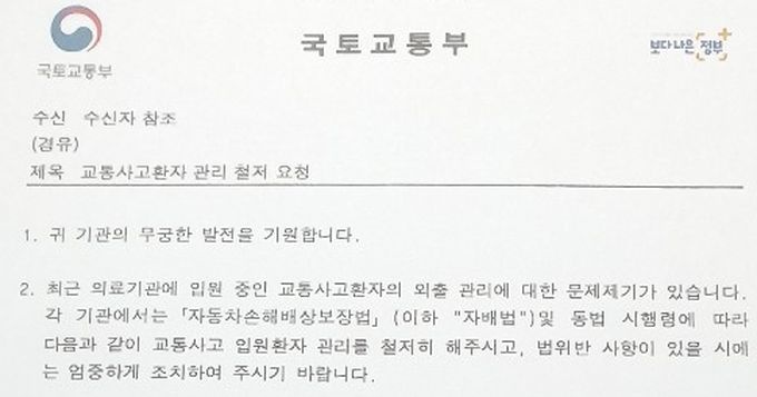 ÇÏÁö¸¸ ±¹ÅäºÎ´Â º¸Çèȸ»ç¿¡¼ ±³Åë»ç°í ȯÀÚÀÇ ¿ÜÃâ, ¿Ü¹Ú ±â·ÏÀ» ¿¶÷Çϰųª û±¸ÇÒ °æ¿ì ÀÇ·á±â°üµéÀº Àû±Ø ÇùÁ¶ÇØ¾ß ÇÑ´Ù¸ç Á¶»ç¸¦ µ¶·ÁÇÏ´Â µî º¹ÁöºÎ¿Í´Â »ó¹ÝµÈ ÇàÁ¤À» Æñ´Ù.