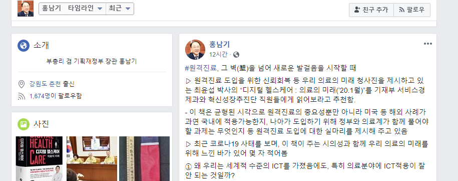 È«³²±â ºÎÃѸ®´Â 12ÀÏ ´ÊÀº ¹ã ÀÚ½ÅÀÇ ÆäÀ̽ººÏ °èÁ¤À» ÅëÇØ "¿ø°ÝÁø·á µµÀÔÀ» À§ÇÑ ½Å·Ú ȸº¹ µî ¿ì¸® ÀÇ·áÀÇ ¹Ì·¡ û»çÁøÀ» Á¦½ÃÇϰí ÀÖ´Â ÃÖÀ±¼· ¹Ú»çÀÇ 'µðÁöÅÐ ÇコÄɾî : ÀÇ·á ¹Ì·¡'¸¦ ±âÀçºÎ ¼ºñ½º°æÁ¦°ú¿Í Çõ½Å¼ºÀåÃßÁø´Ü Á÷¿øµé¿¡°Ô Àо¶ó°í ÃßõÇß´Ù"°í ¹àÇû´Ù.