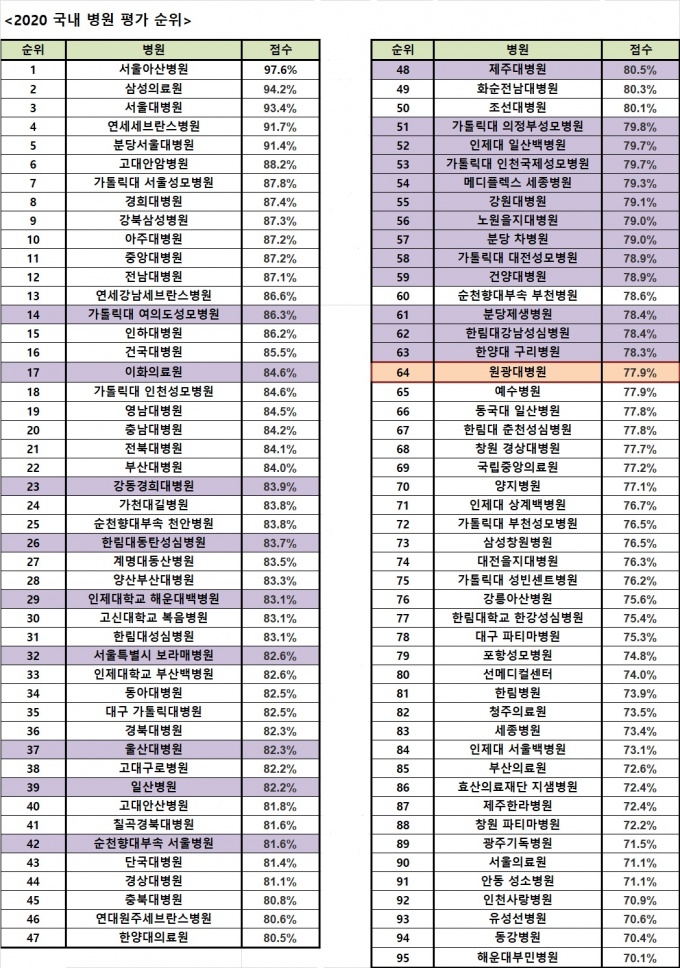 »ó±ÞÁ¾ÇÕº´¿ø Æò°¡¿¡¼ 33À§¸¦ ±â·ÏÇÑ Ä¥°î°æºÏ´ëº´¿ø±îÁö ´º½ºÀ§Å©°¡ ¼±Á¤ÇÑ ±¹³» º´¿ø Æò°¡ 42À§ ¾È¿¡ À̸§À» ¿Ã·È´Ù. 34À§ÀÎ ´Ü±¹´ëº´¿øºÎÅÍ´Â »ó±ÞÁ¾ÇÕº´¿øÀÓ¿¡µµ Áß¼Òº´¿øµé¿¡ ÀÚ¸®¸¦ ³»Áá´Ù.