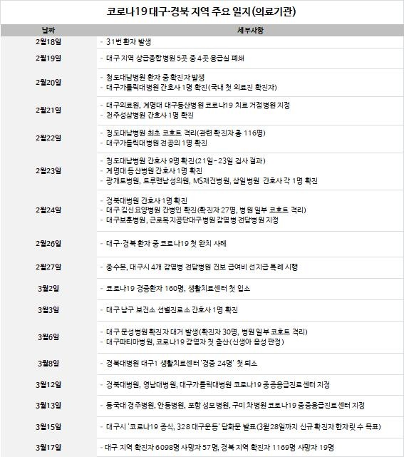 ¡ã3¿ù17ÀÏ = 3¿ù17ÀÏ 0½Ã ±âÁØ, ´ë±¸ Áö¿ª È®ÁøÀÚ´Â 6098¸í »ç¸ÁÀÚ 57¸í, °æºÏ Áö¿ª È®ÁøÀÚ 1169¸í »ç¸ÁÀÚ 19¸íÀÌ´Ù.