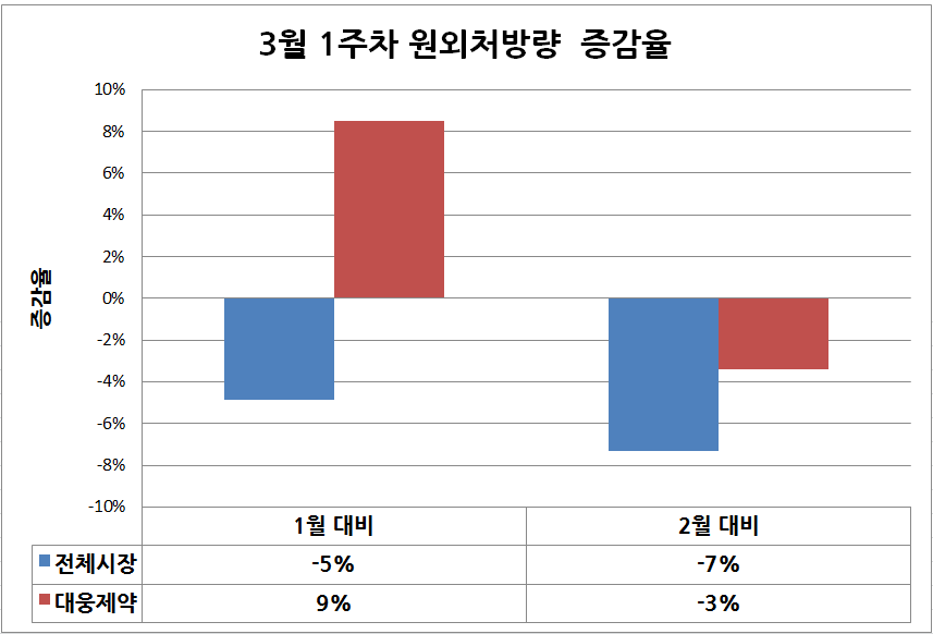 ÀǾàǰ ½ÃÀåÁ¶»ç¾÷ü À¯ºñ½ºÆ®¿¡ µû¸£¸é, ´ë¿õÁ¦¾àÀÇ ÄÚÇÁ·Î¸ð¼Ç ǰ¸ñ Æ÷ÇÔ ±âÁØ 3¿ù ù°ÁÖ Ã³¹æ·®ÀÌ 1¿ù ÁÖÆò±Õ ´ëºñ 9% ¼ºÀåÇß´Ù.