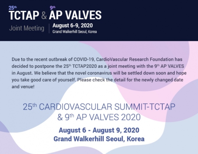 4¿ù ¸» ¿¹Á¤µÆ´ø ±¹³»¼ °³ÃֵǴ ½ÉÀåÁúȯ °ü·Ã ÇмúÇà»ç Áß ¼¼°èÀû ±Ô¸ðÀÇ °ü»óµ¿¸ÆÁßÀç½Ã¼ú ±¹Á¦ÇмúȸÀÇ(TCTAP 2020)µµ Äڷγª19°¡ È®»êµÊ¿¡ µû¶ó ÀÏÁ¤ÀÌ º¯°æµÆ´Ù.