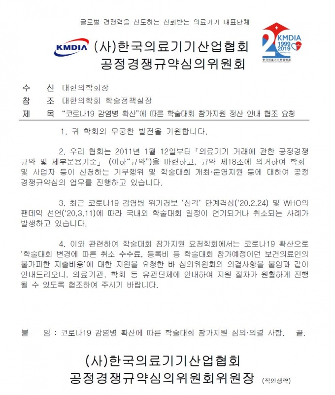 Çѱ¹ÀÇ·á±â±â»ê¾÷Çùȸ´Â ÃÖ±Ù ´ëÇÑÀÇÇÐȸ¿¡ 'Äڷγª19 °¨¿°º´ È®»ê¿¡ µû¸¥ Çмú´ëȸ Âü°¡Áö¿ø Á¤»ê ¾È³» ÇùÁ¶ ¿äû' °ø¹®À» º¸³» ÀÌ °°Àº ³»¿ëÀ» ¾È³»Çß´Ù.