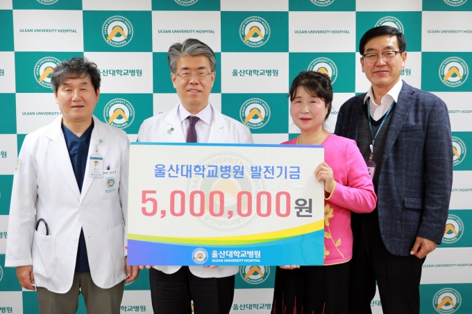 [µ¥Àϸ®¸Þµð ¹Ú¹Î½Ä ±âÀÚ] ¿ï»ê´ëÇб³º´¿ø(º´¿øÀå Á¤À¶±â)´Â ÃÖ±Ù ¿ï»ê´ëÇб³º´¿ø º»°ü ºÎ¼Ó¿î¿µÈ¸Àǽǿ¡¼ ¹ßÀü±â±Ý Àü´Þ½ÄÀ» °³ÃÖÇß´Ù. À̳¯ Àü´Þ½Ä¿¡¼ ¿ï»ê´ëº´¿ø îñ Á÷¿øÀÎ ¹Ú¿µ½Ç¾¾°¡ º´¿ø ¹ßÀüÀ» À§ÇØ 500¸¸¿øÀ» ±âºÎÇß´Ù°í 27ÀÏ ¹àÇû´Ù.