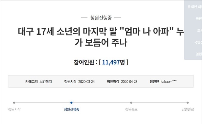 27ÀÏ Ã»¿Í´ë ±¹¹Îû¿ø °Ô½ÃÆÇ¿¡ µû¸£¸é Áö³ 24ÀÏ ‘´ë±¸ 17¼¼ ¼Ò³âÀÇ ¸¶Áö¸· ¸» “¾ö¸¶ ³ª ¾ÆÆÄ” ´©°¡ º¸µë¾î ÁÖ³ª’¶ó´Â û¿ø±ÛÀÌ ¿Ã¶ó¿Ô´Ù.