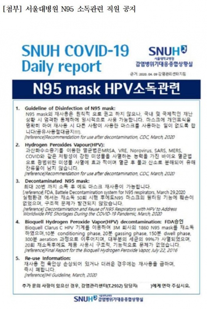 [µ¥Àϸ®¸Þµð ¹ÚÁ¤¿¬ ±âÀÚ] ¼¿ï´ëÇб³º´¿ø ³ëÁ¶´Â 10ÀÏ "ÃÖ±Ù º´¿øÀÌ ¹°·® ºÎÁ·À» ÀÌÀ¯·Î N95 ¸¶½ºÅ©¸¦ ¼Òµ¶ÇØ Àç»ç¿ëÇ϶ó´Â ÁöħÀ» ³»³ù´Ù"¸ç "1ȸ¿ë »ç¿ëÀÌ ¿øÄ¢ÀÎ ¸¶½ºÅ©¸¦ Àç»ç¿ëÇÑ´Ù¸é ÀÇ·áÁøÀÌ °¨¿° À§Çè¿¡ ³»¸ô¸®°Ô µÉ °Í"À̶ó°í ÁÖÀåÇÏ´Â µî ¹Ý¹ßÇß´Ù. ¹ÎÁÖ³ëÃÑ °ø°ø¿î¼ö³ëÁ¶ ÀǷῬ´ëº»ºÎ ¼¿ï´ëºÐȸ¿¡ µû¸£¸é ¼¿ï´ëº´¿ø °¨¿°°ü¸®¼¾ÅÍ´Â Áö³ 4¿ù 3ÀÏ N95 ¸¶½ºÅ© Àç»ç¿ë ÁöħÀ» ¹ßÇ¥Çß´Ù. ¹Ì±¹ 3M·ÎºÎÅÍ ¹°Ç°ÀÌ ¼öÀÔµÇÁö ¾Ê¾Æ ºÎµæÀÌÇÑ Á¶Ä¡¿´´Ù´Â °ÍÀÌ º´¿øÃø ¼³¸íÀÌ´Ù. °øÁö¸¦ ÅëÇØ º´¿øÀº "Àç»ç¿ëÀ» À§ÇØ ¸¶½ºÅ©¸¦ ȸ¼öÇÑ´Ù"¸ç ¸¶½ºÅ©¿¡ ºÎ¼¸í°ú À̸§À» ¸ÅÁ÷À¸·Î ±âÀçÇÏ°í ¿À¿° ¹°Ç°Åë¿¡ ¼öÁýÇÒ °ÍÀ» °øÁöÇß´Ù. ÀÌ¿¡ ³ëÁ¶´Â "Á߾ӹ濪´ëÃ¥º»ºÎ ÁöħÀ» º¸¸é N95 ¸¶½ºÅ© Àç»ç¿ë¿¡ ´ëÇÑ ³»¿ëÀº ³ª¿ÍÀÖÁö ¾Ê´Ù"¸ç "ÀÏȸ¿ëÀÌ ¿øÄ¢ÀÎ ¸¶½ºÅ©¸¦ Àç»ç¿ë Ç϶ó´Â °Í"À̶ó¸ç ¹Ý¹ßÇÏ°í ³ª¼¹´Ù. ³ëÁ¶´Â "º´¿ø ÃøÀÌ Á¦½ÃÇÑ Àç»ç¿ë ±Ù°Å´Â ½ÇÇè½Ç ȯ°æ¿¡¼ °ËÁõÇÑ ÇØ¿Ü ³í¹® 1°Ç »ÓÀÌ´Ù"¸ç "¼Òµ¶ ¹× »ç¿ë ȯ°æ¿¡ µû¶ó ´Þ¶óÁö´Â ¾ÈÀü¼ºÀ» Á¦´ë·Î °ËÁõÇϱâ À§Çؼ± ¼¿ï´ëº´¿ø¿¡¼ Á÷Á¢ ½ÇÇèÇß¾î¾ß ÇÑ´Ù"°í ¸ñ¼Ò¸®¸¦ ³ô¿´´Ù. ¼öÀÔ ¹°·®ÀÌ ºÎÁ·ÇÏ´Ù´Â º´¿ø ¼³¸í¿¡ ´ëÇØ¼± "Áß¾Ó»ç°í¼ö½Àº»ºÎ ¹°ÀÚ°ü¸®ÆÀ¿¡ È®ÀÎÇÑ °á°ú '¹°·®À» ÃæºÐÈ÷ È®º¸Çß°í º´¿ø¿¡¼ ½ÅûÇÏ´Â ¸¸Å Áö±ÞÇϰí ÀÖ´Ù'´Â ´äº¯À» ¹Þ¾Ò´Ù"°í ÁÖÀåÇß´Ù. À̰°Àº ³í¶õ¿¡ º´¿øÀº ±¹³» »ý»êǰÀÌ ¾Æ´Ñ ¼öÀÔ ¹°·® È®º¸´Â ¿©ÀüÈ÷ ¾î·Á¿î »óȲÀ̶ó°í ÇØ¸íÇß´Ù. ¼¿ï´ëº´¿ø °ü°èÀÚ´Â "ÇöÀç ¹Ì±¹ 3M»çÀÇ ¸¶½ºÅ©´Â ¼öÃâ±ÝÁö·Î Á¦Ç°À» µé¿©¿À´Â°Ô ¾î·Á¿î »óȲ"À̶ó¸ç "±¹³» »ý»êǰÀ» ¹Þ¾ÒÀ¸³ª, ±Ô°Ý(¹ÐÂøµµ °Ë»ç ½Ã °ø±â´©Ãâ·ü 8% ÀÌÇÏ)ÀÌ ¸ÂÁö ¾Ê¾Ò´Ù"°í ¼³¸íÇß´Ù. ¶Ç ÇöÀç±îÁö Àç»ç¿ë »ç·Ê´Â ¾ø´Ù°í Çß´Ù. ±×´Â À̾î "Ȥ½Ã³ª ¸ð¸¦ »çÅ¿¡ ´ëºñ ÇØ¿Ü³í¹®¿¡ ±Ù°ÅÇÑ FDA ½ÂÀÎÀ» ¹ÞÀº ÇÁ·ÎÅäÄÝ·Î ¸¶½ºÅ©¸¦ ¼Òµ¶Çϰí ÀÖÁö¸¸, ¾ÆÁ÷±îÁö Àç»ç¿ë »ç·Ê´Â ¾ø´Ù"¸ç "¹°·® È®º¸¿¡ ´ëÇØ¼± Á¶¸¸°£ ¾÷ü¿Í ¹ÌÆÃÀ» ÅëÇØ º¸¿ÏÁ¡À» ãÀ» ¿¹Á¤"À̶ó°í ¸»Çß´Ù.