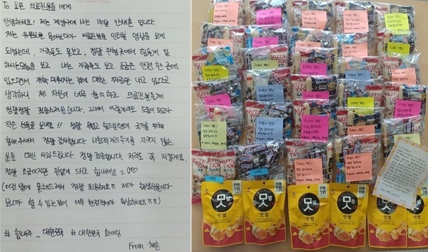 [µ¥Àϸ®¸Þµð ÀÓ¼ö¹Î ±âÀÚ] ÀÎõ Áö¿ª ÁßÇлýÀÌ ÀÎõÀÇ·á¿ø ÀÇ·áÁø¿¡°Ô À§¹®Ç°°ú ¼Õ ÆíÁö¸¦ º¸³» ÀÀ¿øÀÇ ¸¶À½À» ÀüÇß´Ù.