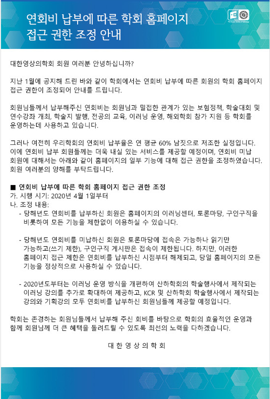 ´ëÇÑ¿µ»óÀÇÇÐȸ´Â Ãֱ٠ȨÆäÀÌÁö¸¦ ÅëÇØ ¿¬È¸ºñ ³³ºÎ¿¡ µû¶ó 4¿ù 1ÀϺÎÅÍ È¸¿øµéÀÇ ÇÐȸ ȨÆäÀÌÁö ÀÌ¿ë ±ÇÇÑÀÌ Á¶Á¤µÈ´Ù°í ¹àÇû´Ù.