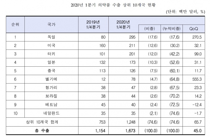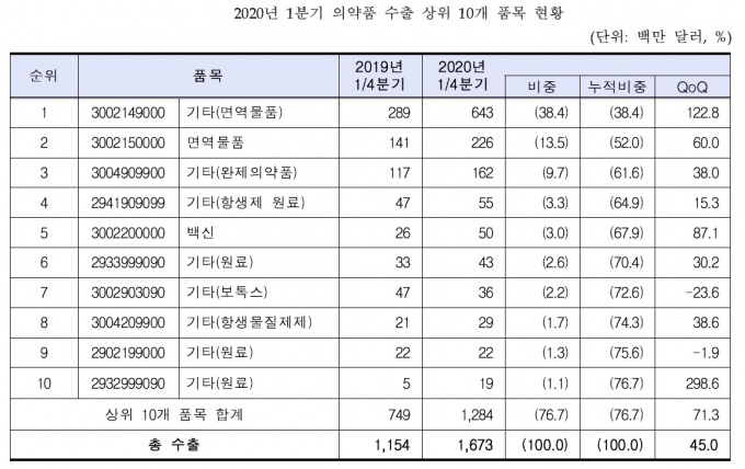 ÃÖ±Ù ¹ß°£ÇÑ Çѱ¹º¸°Ç»ê¾÷ÁøÈï¿ø º¸°í¼¿¡ µû¸£¸é 2020³â 1ºÐ±â ±¹³» ÀǾàǰ ¼öÃâ¾×Àº 16¾ï7000¸¸ ´Þ·¯(¾à 2Á¶328¾ï¿ø)·Î Àü³â µ¿±â ´ëºñ 45% Áõ°¡ÇÏ¸ç ¼ºÀå¼¼¸¦ À̾´Ù.