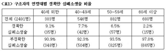 ƯÈ÷ Á¤È®ÇÑ ½ÉÆó¼Ò»ý¼ú ºñÀ²Àº ÀϹÝÀÎ ±¸Á¶ÀÚÀÇ ¿¬·É´ë°¡ ³ô¾ÆÁú¼ö·Ï ³·¾ÆÁ³´Ù. 40¼¼ ¹Ì¸¸Àº 9.1%, 40´ë´Â 7.7%, 50´ë´Â 6.5%, 60´ë ÀÌ»óÀº 2.2%·Î ³ªÅ¸³µ´Ù. [Ç¥1]