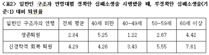 Á¤È®ÇÏÁö ¾ÊÀº °æ¿ìº¸´Ù »ýÁ¸Åð¿øÀ²Àº 2.8¹è, ½Å°æÇÐÀû ȸº¹·üÀº 4.3¹è Áõ°¡Çß´Ù. ƯÈ÷ 60¼¼ ÀÌ»ó ÀϹÝÀÎ ±¸Á¶ÀÚ°¡ ¿Ã¹Ù¸¥ ½ÉÆó¼Ò»ý¼úÀ» ÇÑ °æ¿ì ȯÀÚÀÇ »ýÁ¸Åð¿øÀ²Àº 4.4¹è, ³ú±â´É ȸº¹·üÀº 7.6¹è±îÁö ³ô¾ÆÁ³´Ù.[Ç¥2]