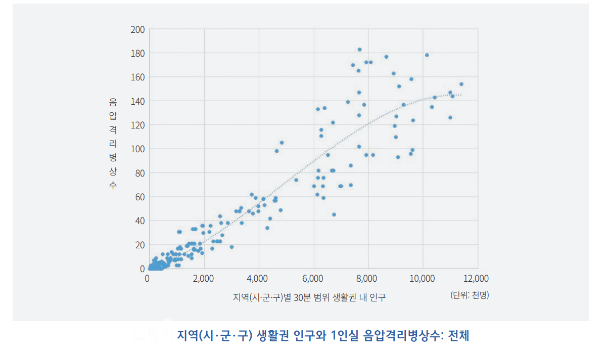 Â÷·®À¸·Î À̵¿ °¡´ÉÇÑ ¹üÀ§(15ºÐ/30ºÐ/60ºÐ/90ºÐ)·Î »ýȰ±ÇÀ» ±¸ºÐÇØ ºÐ¼®ÇÑ °á°ú, 15ºÐ ¹üÀ§ »ýȰ±Ç ³»¿¡¼´Â Àα¸°¡ ÀûÀº °æ¿ì À½¾Ð°Ý¸®º´»óÀÌ ¾ø´Â Áö¿ªµµ ÀÖ¾úÀ¸³ª »ýȰ±ÇÀ» È®ÀåÇÒ °æ¿ì Àα¸ 10¸¸¸í ´ç 1ÀÎ½Ç À½¾Ð°Ý¸®º´»ó¼ö´Â ´ë·« 1.2°³¿¡ ¼ö·ÅÇϰí ÀÖ´Â °ÍÀ¸·Î ³ªÅ¸³µ´Ù.