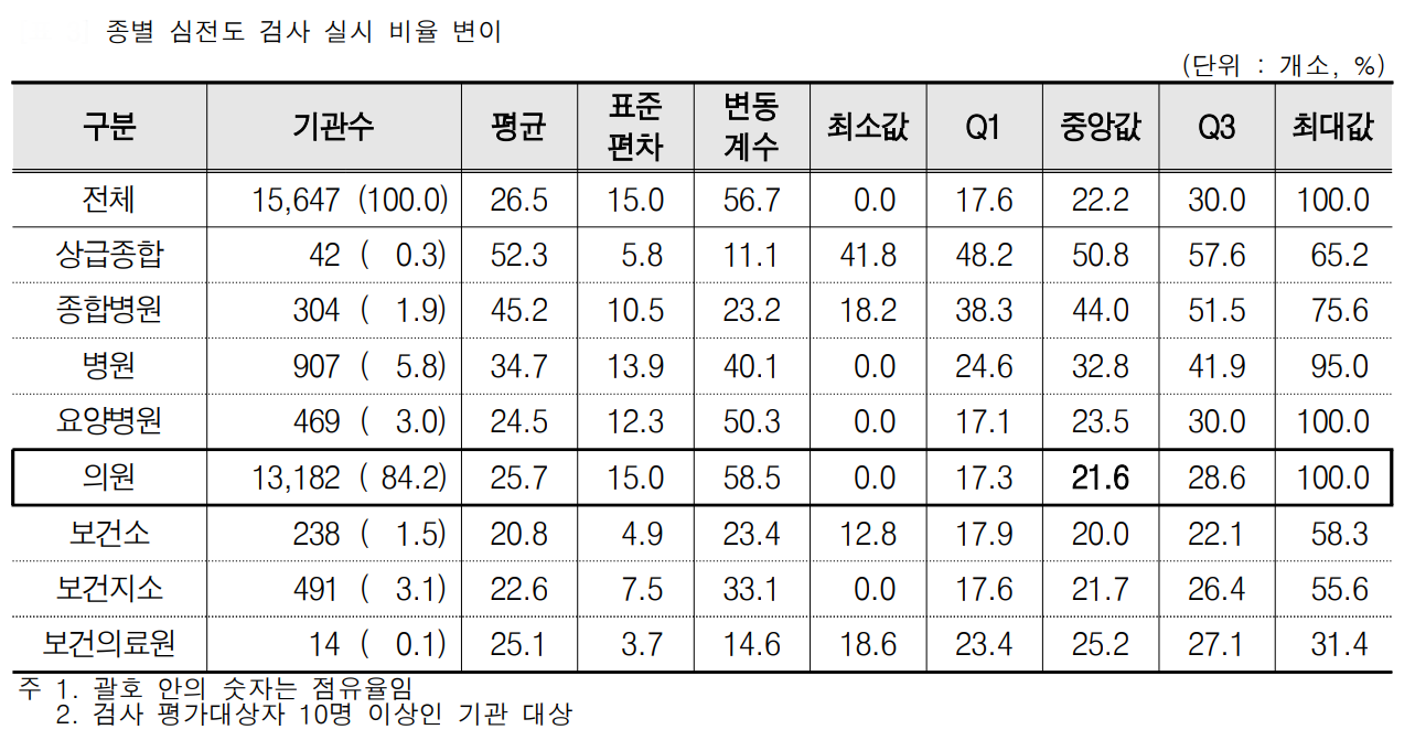 ¿ä ÀÏ¹Ý °Ë»ç ½Ç½Ã ºñÀ²µµ »ó±ÞÁ¾ÇÕ 57.0% > Á¾ÇÕº´¿ø 51.1% > º´¿ø 41.9% > ÀÇ¿ø 28.9%, ½ÉÀüµµ °Ë»ç ½Ç½Ã ºñÀ²Àº »ó±ÞÁ¾ÇÕ 50.8% > Á¾ÇÕº´¿ø 44.0% > º´¿ø 32.8% > ÀÇ¿ø 21.6% ¼ø¼¿´´Ù.