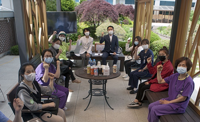 ÀÌ¿¡ ¼¿ïÀÇ·á¿øÀº Áß¶û¸¾ Ä«ÆäÀÇ ÀϺΠȸ¿øµéÀ» º´¿øÀ¸·Î ÃÊ´ëÇØ °¨»çÀÇ ¸¶À½À» ÀüÇÏ´Â ÀÚ¸®¸¦ ¸¸µé¾ú´Ù. ¼¿ïÀÇ·á¿øÀº Äڷγª19 ¿¹¹æ Â÷¿ø¿¡¼ »çȸÀû °Å¸®µÎ±â¸¦ Àû¿ëÇϱâ À§ÇØ ¾ß¿Ü Á¤¿ø¿¡¼ ¸¸³²À» °¡Á³°í, ¸ðÀÓ Àü Âü¼®ÀÚ Àü¿ø ¹ß¿Ã¼Å©, ¼Õ¼Òµ¶, ¸¶½ºÅ© Âø¿ëÀ» ½Ç½ÃÇß´Ù.
