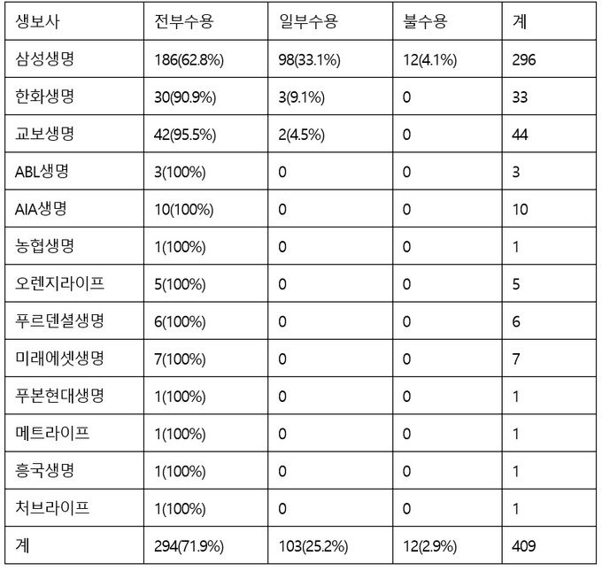 ¾÷°è 1À§ »ï¼º»ý¸íÀº 296°Ç Áß 186°Ç¿¡ ´ëÇØ¼¸¸ ¾Ï ÀÔ¿øºñ¸¦ ÀüºÎ Áö±ÞÇß´Ù. 33.1%¿¡ ÇØ´çÇÏ´Â 98°ÇÀº ÀϺθ¸ ¼ö¿ëÇß°í 4.1%ÀÎ 12°ÇÀº Áö±Þ±Ç°í¸¦ ÀüÇô ¼ö¿ëÇÏÁö ¾Ê¾Ò´Ù.