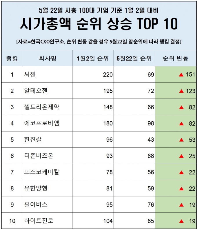 26ÀÏ ±â¾÷ºÐ¼® Àü¹® Çѱ¹CXO¿¬±¸¼Ò(¼ÒÀå ¿ÀÀϼ±)°¡ ‘2020³â 1¿ù2ÀÏ ´ëºñ 5¿ù22ÀÏ ½Ã°¡ÃÑ¾× 100´ë ±â¾÷ ¼øÀ§ º¯µ¿ ºÐ¼®’ °á°ú¸¦ ¹ßÇ¥Çß´Ù. ½Ã°¡ÃÑ¾× ¼øÀ§´Â ¿ì¼±ÁÖ ÁÖ½ÄÁ¾¸ñÀ» Á¦¿ÜÇÑ º¸ÅëÁÖ ±âÁØÀÌ´Ù.