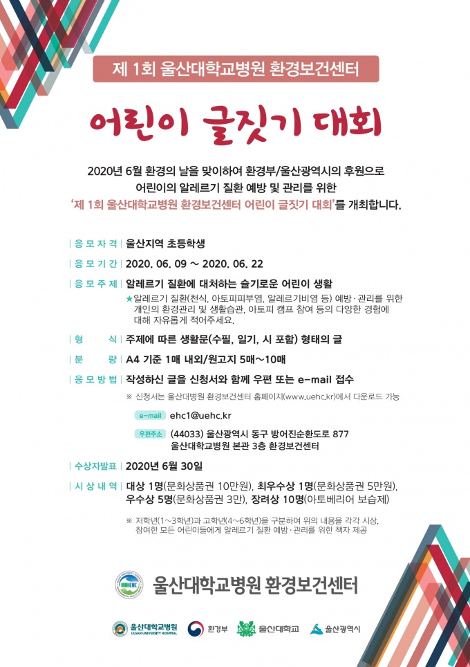 ¿ï»ê´ëÇб³º´¿ø ȯ°æº¸°Ç¼¾ÅÍ´Â 6¿ù ȯ°æÀÇ ³¯À» ¸ÂÀÌÇØ ȯ°æºÎ¿Í ¿ï»ê±¤¿ª½ÃÀÇ ÈÄ¿øÀ¸·Î ¾î¸°À̵éÀÇ ¾Ë·¹¸£±â Áúȯ ¿¹¹æ ¹× °ü¸®¸¦ À§ÇØ À̹ø ±ÛÁþ±â ´ëȸ¸¦ °³ÃÖÇÑ´Ù. ¿ï»ê½Ã¿¡ ÀÖ´Â ¸ðµç ÃʵîÇлýÀÌ¸é ´©±¸³ª Âü¿© °¡´ÉÇÏ´Ù.