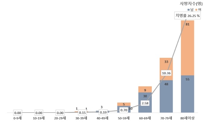 80¼¼ ÀÌ»óÀÇ °æ¿ì¿¡´Â Ä¡¸í·üÀÌ 25.92%¿¡ ´ÞÇØ ±¹³» È®ÁøÀÚ Æò±Õ Ä¡¸í·üÀÎ 2.31%ÀÇ 10¹è°¡ Èǽ ³Ñ´Â ¼öÄ¡¸¦ º¸À̰í ÀÖ´Ù.