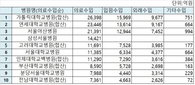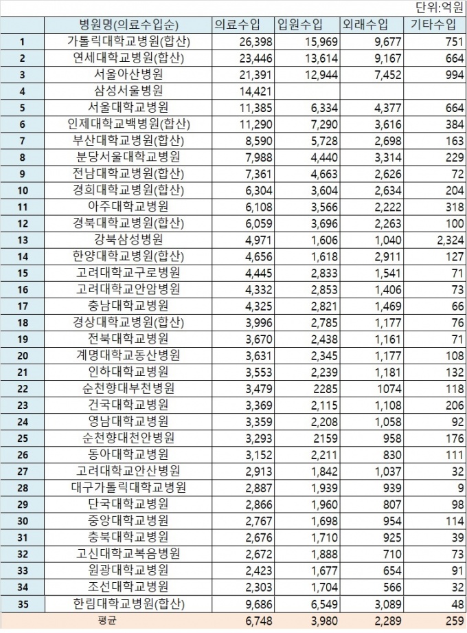 Áö³ÇØ ÀÇ·á¼öÀÔ 1À§´Â °¡Å縯´ëÇб³ ºÎ¼Óº´¿øÀ¸·Î 2Á¶6398¾ïÀ» ±â·ÏÇß´Ù. ÀÔ¿ø¼öÀÔÀº 1Á¶5969¾ï, ¿Ü·¡¼öÀÔÀº 9677¾ï¿¡ ´ÞÇÑ´Ù. ¿¬¼¼´ëÇб³ ºÎ¼Óº´¿øÀÌ 2Á¶3446¾ï, ¼¿ï¾Æ»êº´¿øÀÌ 2Á¶1391¾ï¿øÀ¸·Î µÚ¸¦ µû¶ú´Ù.