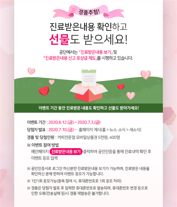 °ø´ÜÀº Á¦µµ Ȱ¼ºÈ¸¦ À§ÇØ 6¿ù 12ÀϺÎÅÍ 7¿ù 3ÀϱîÁö °ø´Ü ȨÆäÀÌÁö ¹× M°Ç°º¸Çè(¾Û)À» ÅëÇØ Áø·á¹ÞÀº³»¿ë º¸±â¸¦ ÀÌ¿ëÇÑ °¡ÀÔÀÚ¸¦ ´ë»óÀ¸·Î ÃÑ 400¸íÀ» Ãß÷, Ä¿ÇÇÀü¹®Á¡ ¸ð¹ÙÀÏ»óǰ±Ç(5õ¿ø)À» Áö±ÞÇÏ´Â °æÇ° À̺¥Æ®¸¦ ÁøÇàÇÑ´Ù. |