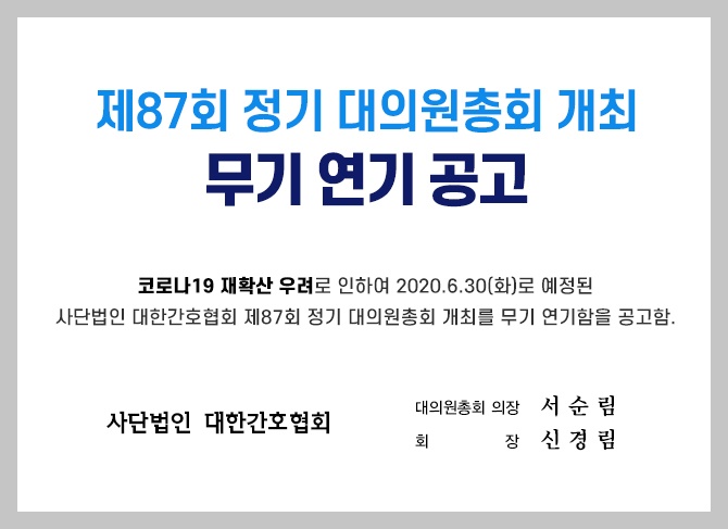 ´ëÇѰ£È£Çùȸ(°£Çù)´Â “Äڷγª19 ÀçÈ®»ê ¿ì·Á·Î ¿À´Â 30ÀÏ ¼¿ï Å©¸®½ºÅ»º¼·ë¿¡¼ °³ÃÖ ¿¹Á¤À̾ú´ø Á¦87ȸ Á¤±â ´ëÀÇ¿øÃÑȸ¸¦ ¹«±âÇÑ ¿¬±âÇÑ´Ù”°í 16ÀÏ °ø°íÇß´Ù.