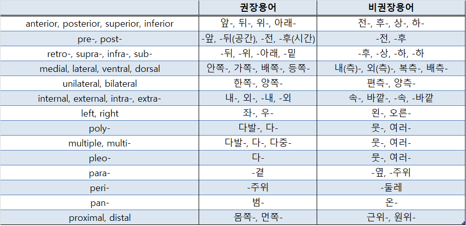 ÀÌ À§¿øÀº ‘sub-’, ‘supra-’, ‘infra-’, ‘retro-’, ‘unilateral’, ‘bilateral’, ‘left’, ‘right’ µîÀº ÇÑ ¿ë¾î¸¦ ¼±Á¤ÇØ ºñ±³Àû ÀϰüµÇ°Ô Çϳª·Î »ç¿ëÇϰí ÀÖÀ¸³ª ±× ¿Ü Á¢µÎ»çµé(‘anterior’, ‘posterior’ µî)Àº ÅëÀϵÇÁö ¾Ê¾Æ ÇÑÀÚ¾î¿Í °íÀ¯¾î¿¡ µû¶ó ´Ù¸£°Ô ¾²À̰í ÀÖ´Ù°í ¹ßÇ¥Çß´Ù.