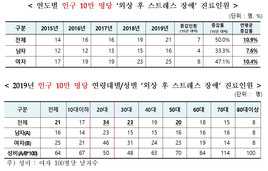 ÀÌ¿¡ µû¸£¸é ¿Ü»ó ÈÄ ½ºÆ®·¹½º Àå¾Ö ȯÀÚ Áø·áÀοøÀº ÃÖ±Ù 5³â°£ ¿¬Æò±Õ 10.9% Áõ°¡ÇÑ °ÍÀ¸·Î ³ªÅ¸³µ´Ù. ¼ºº°·Î º¸¸é ³²ÀÚ´Â 7.6%, ¿©ÀÚ´Â 10.4%°¡ Áõ°¡ÇØ ¿©ÀÚÀÇ Áõ°¡ÆøÀÌ ´õ Å©´Ù.