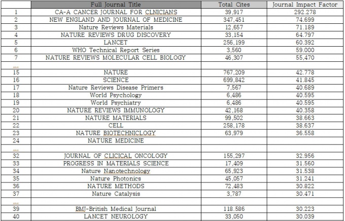 LANCETÀº 60.4·Î 5À§¿¡, JAMA´Â 45.5·Î 12À§¿¡ ¿Ã¶ú´Ù. °úÇÐ ºÐ¾ß¸¦ ¾Æ¿ì¸£´Â NATURE¿Í ScienceÁö´Â °¢°¢ 15, 16À§¸¦ Â÷ÁöÇß´Ù.
