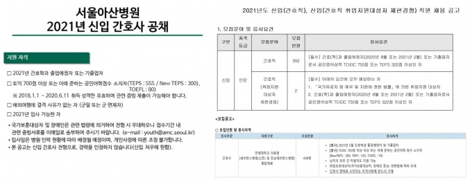 30ÀÏ º´¿ø°è¿¡ µû¸£¸é ¼¿ï¾Æ»êº´¿øÀº ¿ÃÇØ ½ÅÀÔ °£È£»ç °ø°³Ã¤¿ë¿¡¼ Áö¿ø ÀÚ°ÝÀ» ÅäÀÍ 700Á¡ ÀÌ»óÀ¸·Î Á¦ÇÑÇß´Ù. Áö³ÇØ¿¡´Â 650Á¡ ÀÌ»óºÎÅÍ Áö¿øÀÌ °¡´ÉÇߴµ¥ ¿ÃÇØ 50Á¡À» »óÇâÁ¶Á¤ÇÑ °ÍÀÌ´Ù.