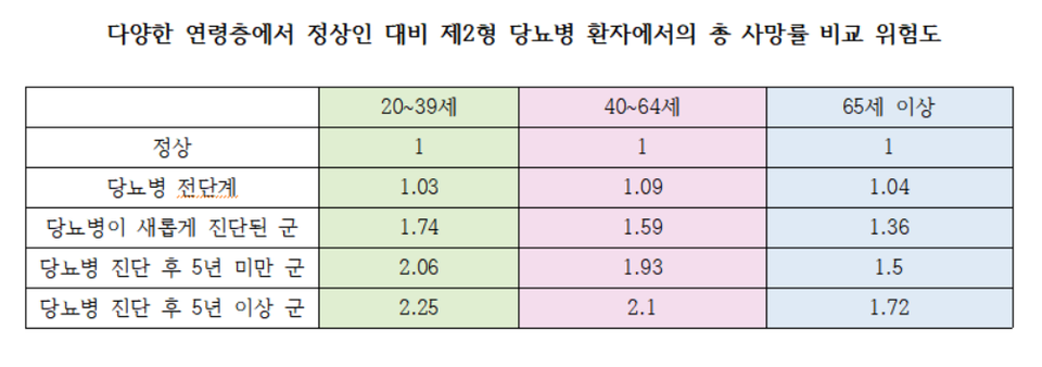 À̸¦ ÅëÇØ Á¤»óÀÎ ´ëºñ ´ç´¢º´À¸·Î ÀÎÇÑ »ç¸Á À§Çèµµ°¡ ÀþÀº ¿¬·ÉÃþÀÌ ´õ ³ô´Ù´Â °ÍÀÌ ±Ô¸íµÆ´Âµ¥ ÀþÀº ¿¬·ÉÃþÀ̾ ´ç´¢º´À¸·Î ÀÎÇÑ »ç¸Á À§Çè¿¡ ¾È½ÉÇÒ ¼ö ¾ø´Ù´Â °ÍÀ» È®ÀÎÇß´Ù.