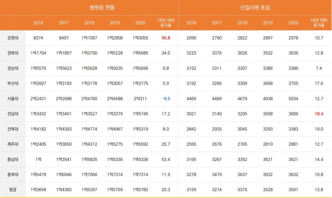 ±¹¸³´ëº´¿ø Áß °°Àº ±â°£ ½ÅÀÔ»ç¿ø ÃÊÀÓÀÌ °¡Àå ¸¹ÀÌ ¿À¸¥ °÷Àº Àü³²´ëº´¿øÀ̾ú´Ù. 2016³â 3021¸¸¿øÀÌ´ø ÃÊÀÓÀº 2020³â 3606¸¸¿øÀ¸·Î 19.4% ´Ã¾î³µ´Ù.