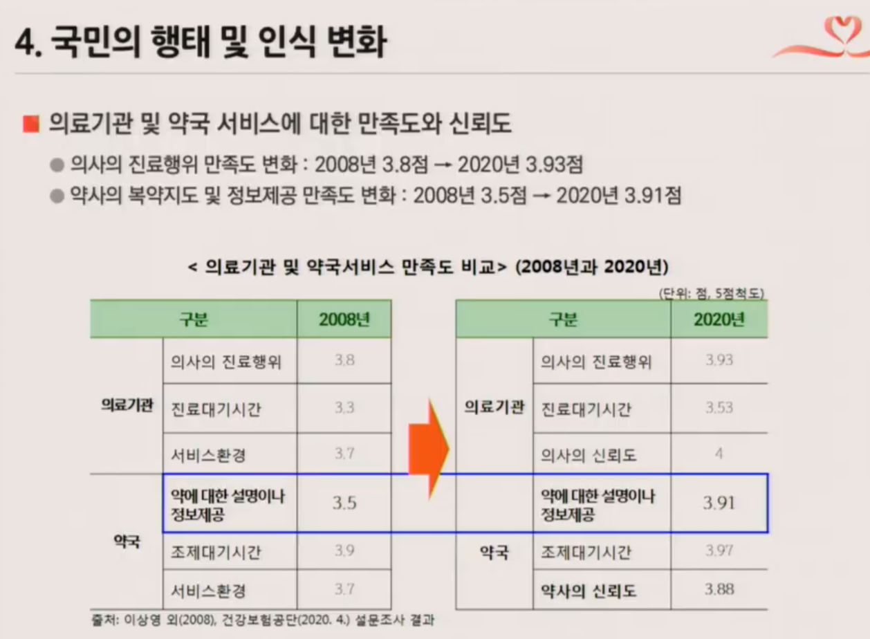 ¶Ç ¾à»ç Áø·áÇàÀ§ ¸¸Á·µµ°¡ 2008³â 3.8Á¡¿¡¼ 2020³â 3.93Á¡À¸·Î ¿Ã¶úÀ¸¸ç, º¹¾àÁöµµ ¹× Á¤º¸Á¦°ø ¸¸Á·µµ º¯È°¡ °°Àº ±â°£ µ¿¾È 3.5Á¡¿¡¼ 3.91Á¡À¸·Î ³ô¾ÆÁ® °ú°Å´ëºñ ÀǷἺñ½º ¸¸Á·µµ°¡ Çâ»óµÆ´Ù´Â ºÐ¼®ÀÌ´Ù.