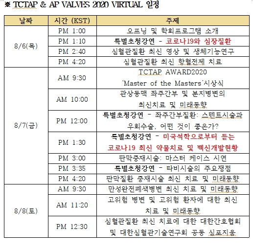 [µ¥Àϸ®¸Þµð ¹ÚÁ¤¿¬ ±âÀÚ] ½ÉÀåÇ÷°ü¿¬±¸Àç´ÜÀÌ ÁÖÃÖÇÏ°í ¼¿ï¾Æ»êº´¿ø ½ÉÀ庴¿øÀÌ ÈÄ¿øÇÏ´Â °ü»óµ¿¸ÆÁßÀç½Ã¼ú ¹× ÆÇ¸·Ä¡·á ±¹Á¦ Çмú´ëȸ(TCTAP & AP VALVES 2020 VIRTUAL)°¡ 8¿ù 6ÀϺÎÅÍ 8ÀϱîÁö »çÈê°£ ¿Â¶óÀÎÀ¸·Î ÁøÇàµÈ´Ù.