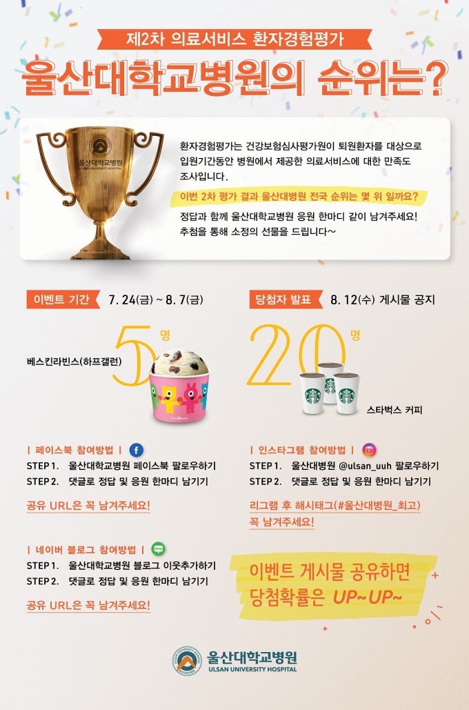 ½Ã¹Î ´©±¸³ª À̺¥Æ®¿¡ Âü¿©°¡´ÉÇϸç, ¹æ¹ýÀº ¿ï»ê´ëÇб³º´¿ø SNS(ÀνºÅ¸±×·¥·ÆäÀ̽ººÏ·ºí·Î±×)¿¡ °ÔÀçµÈ À̺¥Æ® °Ô½Ã¹°¿¡ ÄûÁî Á¤´ä°ú ÇÔ²² ÀÀ¿ø ¸Þ½ÃÁö¸¦ ³²±â¸é ÀÀ¸ð°¡ ¿Ï·áµÈ´Ù.