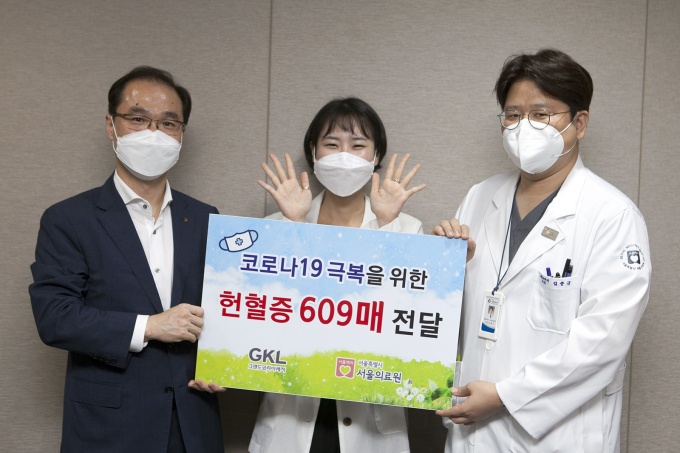 ¼¿ïÀÇ·á¿øÀÌ ±âºÎ ¹ÞÀº ÇåÇ÷ÁõÀº Äڷγª19 Àå±âÈ¿¡ µû¸¥ Á¤ºÎÀÇ ÇåÇ÷ Ä·ÆäÀο¡ µ¿ÂüÇϱâ À§ÇØ GKL ÀÓÁ÷¿øµéÀÇ ÀÚ¹ßÀûÀÎ ÇåÇ÷ Ȱµ¿À» ÅëÇØ ¸ðÀÎ °ÍÀÌ´Ù.