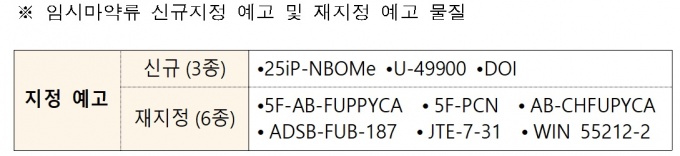 ¶ÇÇÑ ‘5F-AB-FUPPYCA’ µî 6Á¾Àº ÁöÁ¤ È¿·ÂÀÌ 9¿ù 18ÀÏ¿¡ ¸¸·á ¿¹Á¤À̾î¼, ±¹¹Î º¸°Ç»ó À§ÇØ ¿ì·Á¸¦ °í·ÁÇØ ÇâÈÄ 3³â°£ Àӽø¶¾à·ù·Î ´Ù½Ã ÁöÁ¤ ¿¹°íÇÑ´Ù.