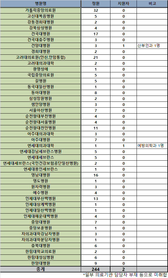 Á¶»çµÈ 44°÷ ÀÇ·á±â°ü ¸ðÁý Á¤¿øÀº ÃÑ 244¸í¿¡ ´ÞÇÏÁö¸¸, Áö¿øÀÚ°¡ ÀÖ¾ú´ø ±â°üÀº °Ç¾ç´ëº´¿ø°ú ¿¬¼¼´ëÀǰú´ëÇÐ ´Ü µÎ °÷ »ÓÀÌ´Ù. ³ª¸ÓÁö´Â Áö¿øÀÚ°¡ Àü¹«Çß´Ù.