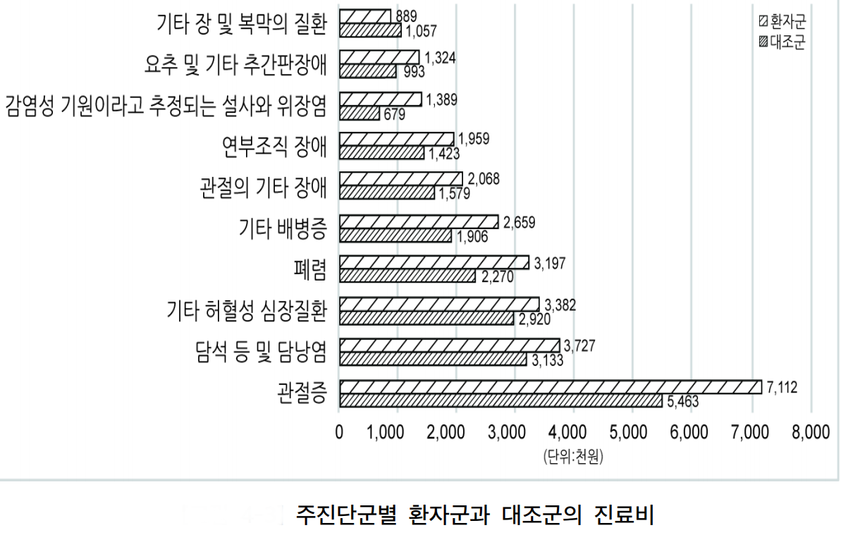 Áø·áºñÀÇ °æ¿ì´Â ±âŸ Àå ¹× º¹¸·ÀÇ Áúȯ Ç׸ñ¿¡¼ À¯ÀÏÇÏ°Ô ´ëÁ¶±º(105¸¸¿ø)ÀÌ °£È£°£º´ÅëÇÕ¼ºñ½º¸¦ ÀÌ¿ëÇÑ È¯ÀÚ±º(88¸¸¿ø)º¸´Ù Áø·áºñ°¡ ´õ µé¾ú°í ³ª¸ÓÁö Áúȯ¿¡¼´Â ´ëÁ¶±º Áø·áºñ°¡ ¸ðµÎ Àû¾ú´Ù.