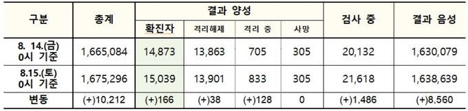 Áúº´°ü¸®º»ºÎ Á߾ӹ濪´ëÃ¥º»ºÎ¿¡ µû¸£¸é 15ÀÏ 0½Ã ±âÁØ ±¹³» Äڷγª19 È®ÁøÀÚ´Â 166¸í Áõ°¡ÇÑ 1¸¸5039¸íÀ¸·Î ³ªÅ¸³µ´Ù. »ç¸ÁÀÚ ¼ö´Â Àü³¯°ú µ¿ÀÏÇÑ 305¸íÀ¸·Î Ä¡¸í·üÀº 2.03%ÀÌ´Ù.