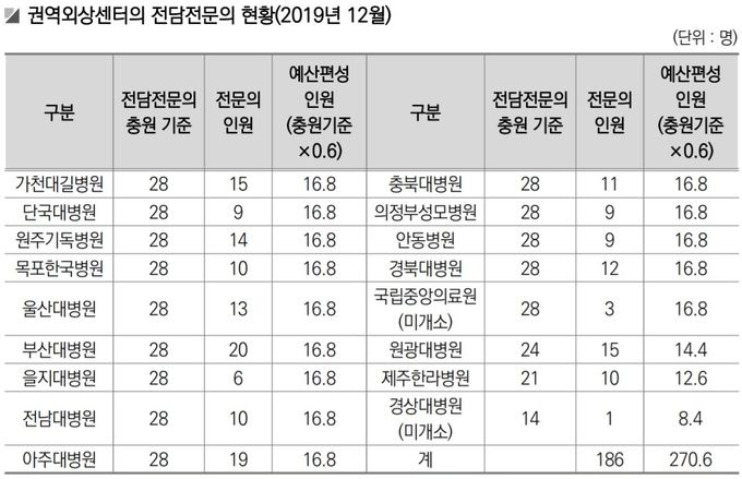 º¸°Çº¹ÁöºÎ¿¡ µû¸£¸é 2019³â 12¿ù ¸» ±âÁØ Àü±¹ 17°³ ±Ç¿ª¿Ü»ó¼¾ÅÍ¿¡ ä¿ëµÅ ÀÖ´Â ÁßÁõ¿Ü»ó Àü´ãÀü¹®ÀÇ´Â 186¸íÀ¸·Î, Á¤»óÀû Àη±âÁØÀÎ 451¸íÀÇ Àý¹Ý¿¡µµ ¹ÌÄ¡Áö ¸øÇß´Ù.
