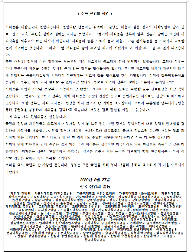 27ÀÏ Àü±¹ ÀüÀÓÀǵéÀº 'Àü±¹ ÀüÀÓÀÇ ¼º¸í'À» ÅëÇØ "±¹¹Î °Ç°°ú ´ëÇѹα¹ ÀÇ·áü°è°¡ ¸Á°¡Áú °ÍÀÌ ºÒ º¸µí »·ÇÑ À̹ø Á¤ºÎÀÇ Á¤Ã¥ ÃßÁø¿¡ ´ëÇØ °·ÂÈ÷ ¹Ý´ëÇÔÀ» °áÀÇÇÏ¸ç »çÁ÷¼¸¦ Á¦ÃâÇÑ´Ù"¸é¼ "¸¸ÀÏ Á¤ºÎ°¡ ÀúÈñ »Ó ¾Æ´Ï¶ó ÈĹè ÀÇÇеµµéÀÇ ²Þ¸¶Àú Áþ¹âÀ¸·Á ÇÑ´Ù¸é ÀúÈñ´Â °áÄÚ Á½ÃÇÏÁö ¾ÊÀ» °Í"À̶ó°í ¹àÇû´Ù.
