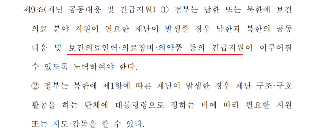 ¹®Á¦°¡ µÈ ³»¿ëÀº ÇØ´ç ¹ý·ü¾È 9Á¶Àε¥ 'ºÏÇÑ¿¡ º¸°ÇÀÇ·á ºÐ¾ß Áö¿øÀÌ ÇÊ¿äÇÑ Àç³ÀÌ ¹ß»ýÇÒ °æ¿ì ³²ÇѰú ºÏÇÑÀÇ °øµ¿ ´ëÀÀ ¹× º¸°ÇÀÇ·áÀη·ÀÇ·áÀåºñ·ÀǾàǰ µîÀÇ ±ä±ÞÁö¿øÀÌ ÀÌ·ïÁú ¼ö ÀÖµµ·Ï ³ë·ÂÇØ¾ß ÇÑ´Ù'´Â ³»¿ëÀ» ´ã°í ÀÖ´Ù.